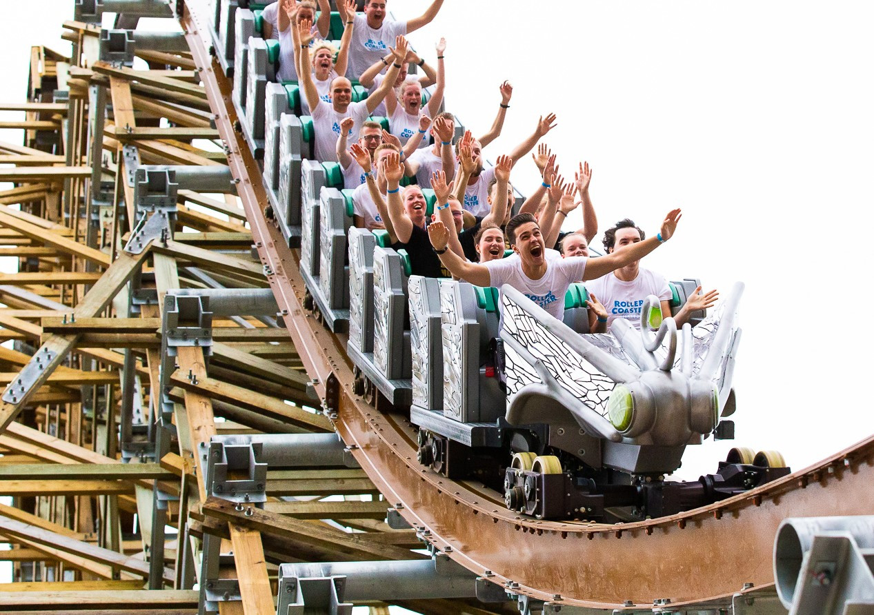 Rollercoaster, achtbaan thrill ride attraction filmed from the ground.